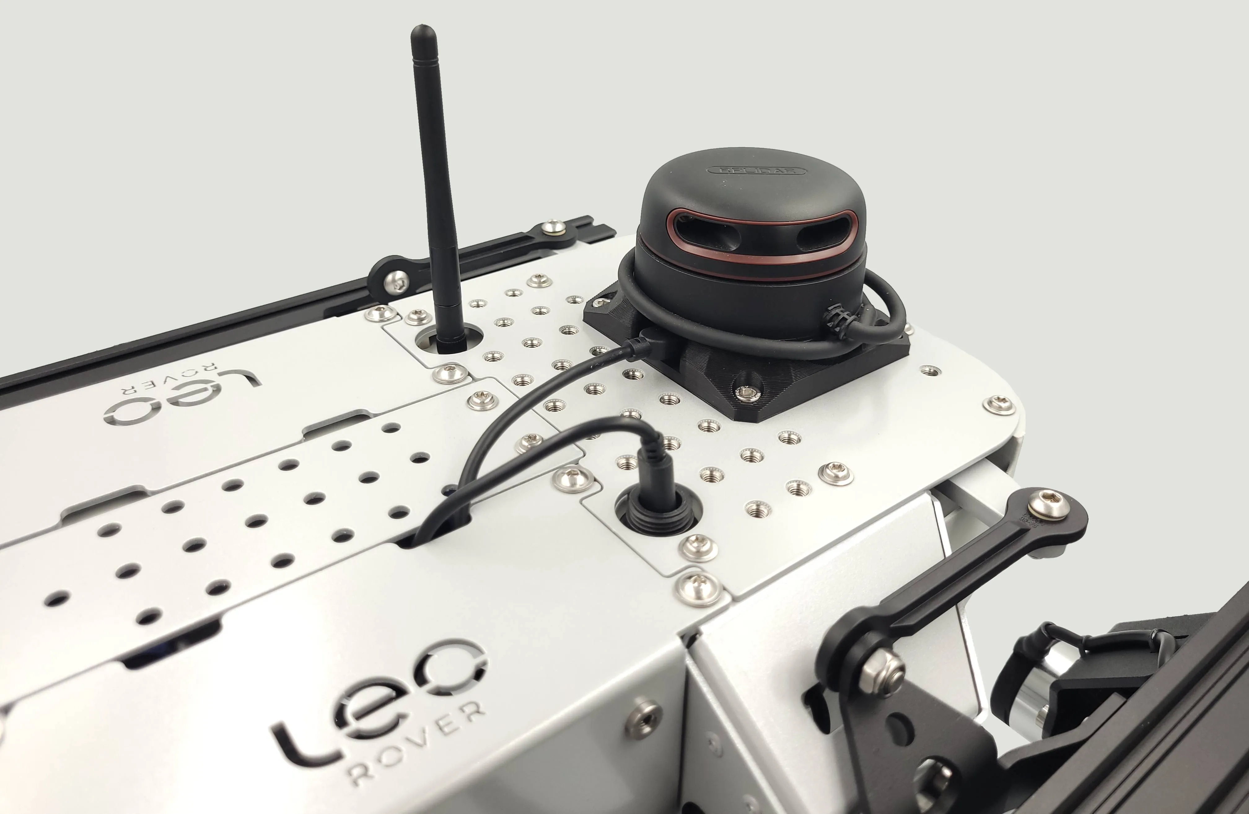 The sensor can be connected to the robot's main computer via the USB socket positioned at the top of the rover. If your USB cable is long it might get into lidars field of view if it sticks up too much. try to hide it in the empty space inside Leo Rovers back frame. Just like on the photo below: