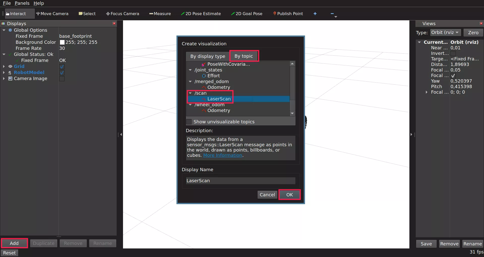 Now, open RViz by typing rviz2 in the terminal, or, if you have the leo_viz
