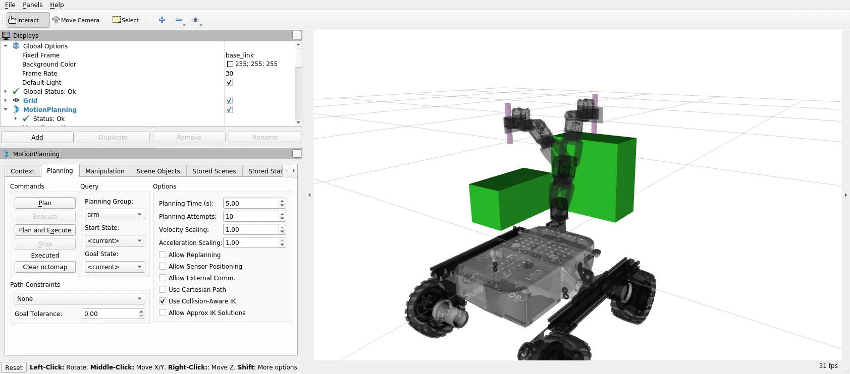 - Click on Planning tab in Motion Planning display and check Approx IK Solutions,