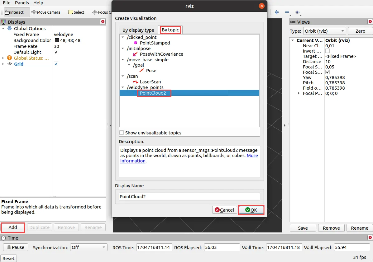 /velodyne_points topic. Choose the PointCloud2 display and click Ok.