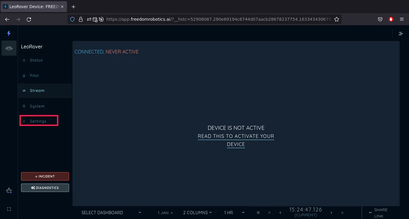 Now we see that the device is connected, although not active even though our rover is still turned on. That's because Freedom Robotics doesn't get any info from any topics from the robot. After the configuration, the robot will be visible as active. So now, from the robot's menu, we go to Settings.