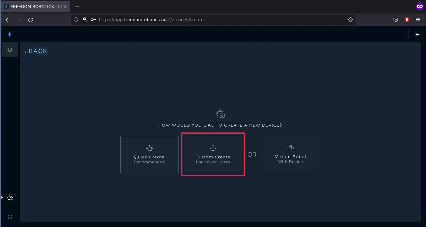 Then, you can choose whether you want to customize your robot, or get a quick installation with some base settings. We will choose the Custom Create option.