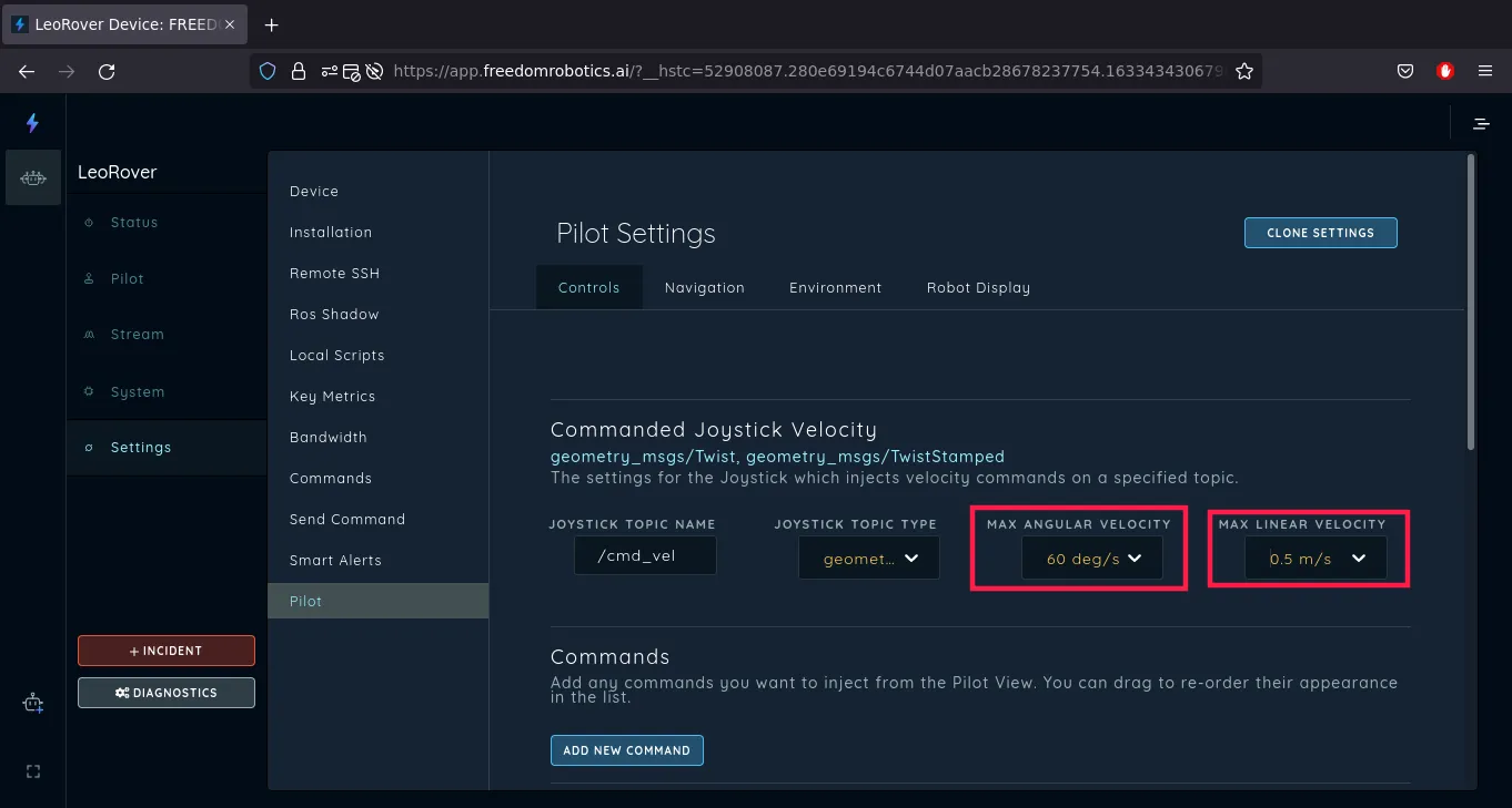 The first step is to configure what topics will be allowed to receive commands from Freedom Robotics. This is useful if you want to add commands for buttons on the joystick (e.g make a photo when pressing the square button), or if you want to pilot the robot using the UI joystick in Freedom Robotics. You have 3 options: